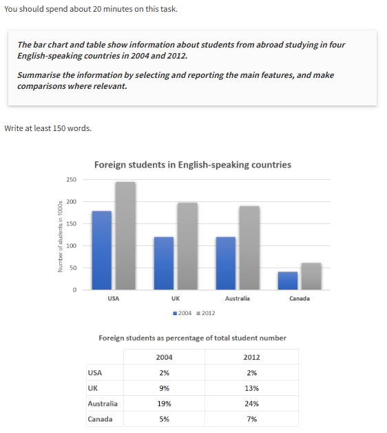 The bar chart shows the number of foreign students studying in four.., while the table show foreign students as a percentage of total student numbers ..